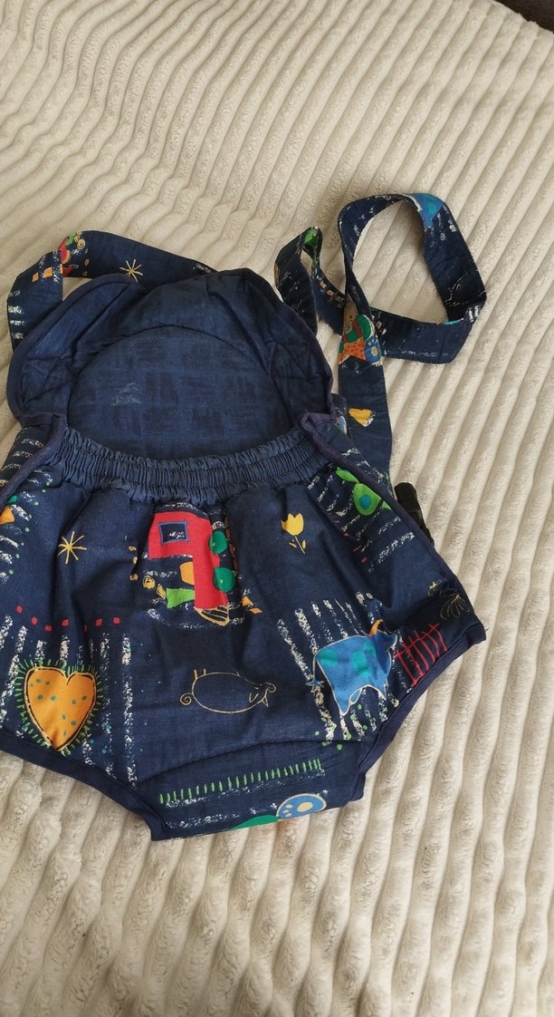 Canlı desenlere sahip koyu çok renkli bebek taşıyıcı, ayarlanabilir askıları ve yumuşak kumaşıyla rahat kullanım sağlar.