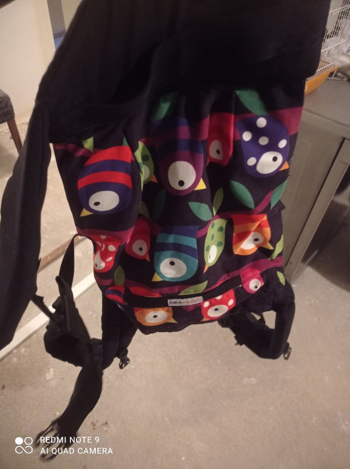 Çok renkli desenlere sahip koyu renkli bebek taşıyıcı. Ayarlanabilir kayışlarla rahat ve güvenli kullanım sağlar.
