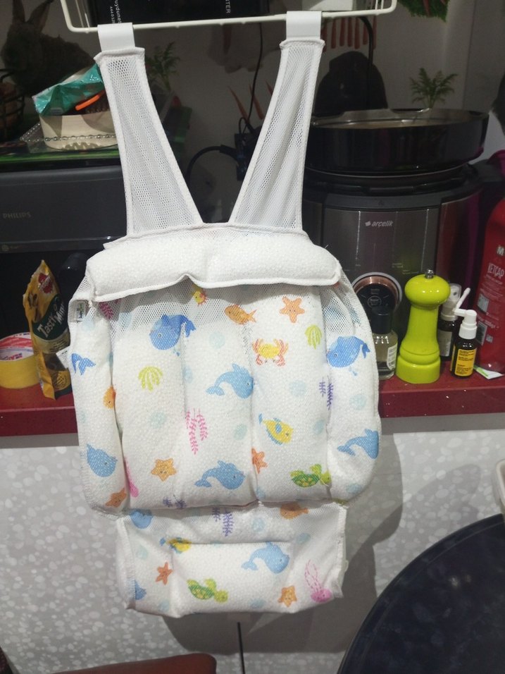 Yumuşak dolgulu, çok renkli deniz hayvanları desenli bebek taşıyıcıdır. Ayarlanabilir askıları konfor sağlar.