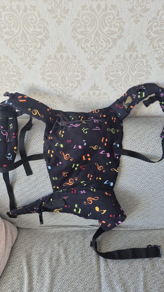 Ayarlanabilir kayışlara sahip, çok renkli müzik notaları desenli koyu renk bebek taşıyıcı. Az kullanılmış hatasız bebeğim büyüdüğü için satıyorum