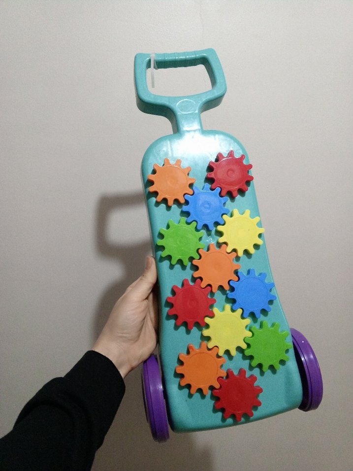 Mor tekerlekli, çok renkli dişlilerle süslenmiş sağlam bebek yürüteci, erken yürümeyi destekler ve eğlencelidir.