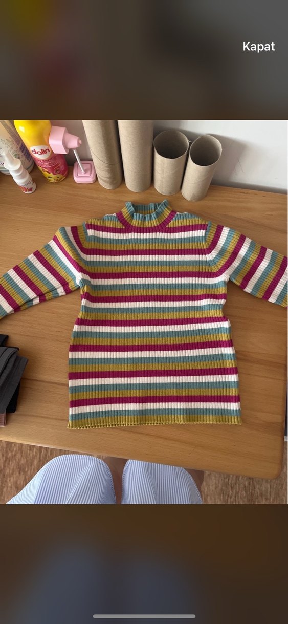 Renkli çizgili, balıkçı yaka, uzun kollu, örgü dokulu kazak.
