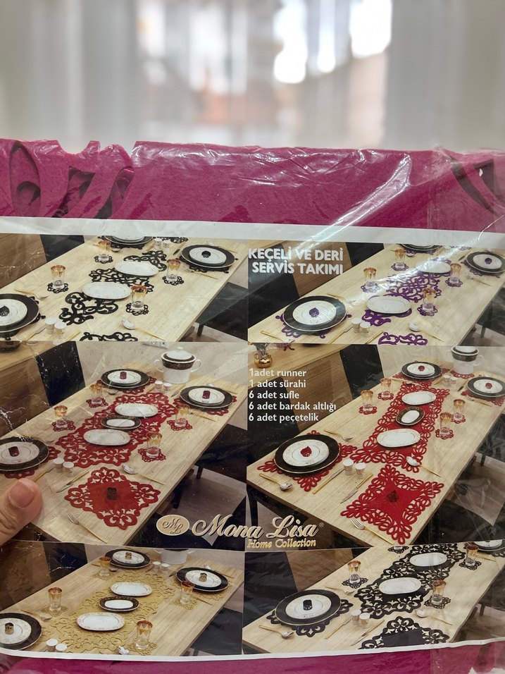 Çok renkli, koyu tonlarda bohem baskılı masa örtüsü setidir. Keçe ve deri malzemelerden oluşur, servis için çeşitli parçalar içerir. ️20 parçadan oluşuyor paketli hiç açılmadı