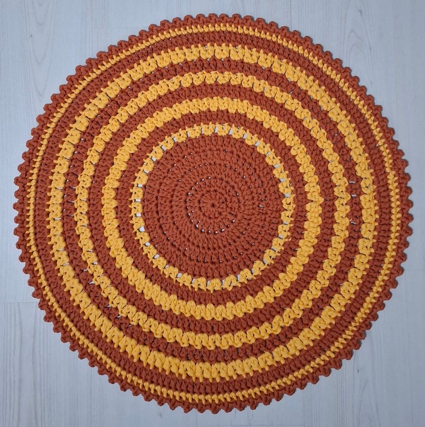 Yuvarlak bohem tarzda, sıcak tonlarda çok renkli çizgili desenlere sahip halı, mekana canlı ve samimi bir hava katar. 74×74cm