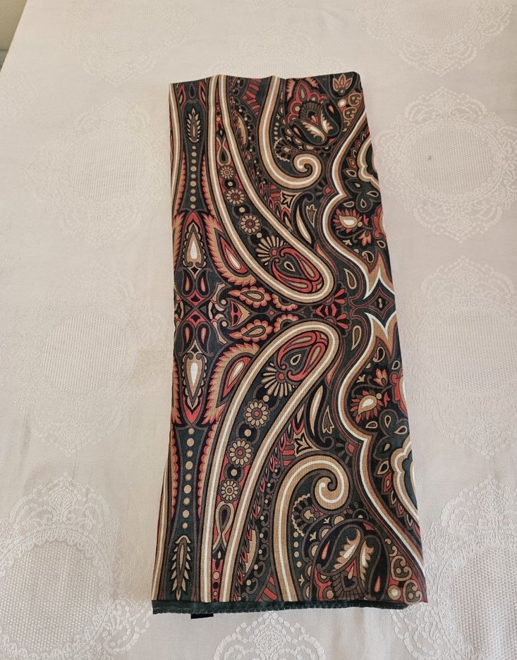 koyu tonlarda çok renkli bohem desenli, paisley ve çiçek motifleriyle süslenmiş şal. Retro ve hippie tarzıyla dikkat çeker. 2 kez kullanıldı gayet iyi durumda...