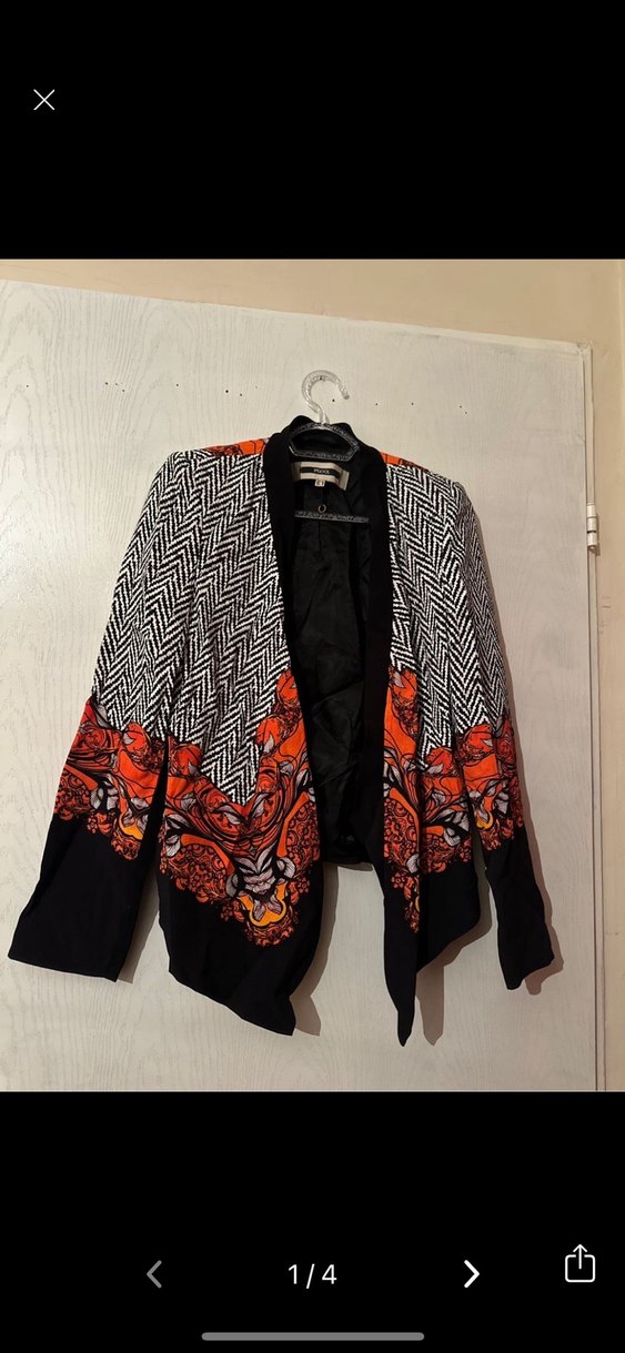 Kadınlar için çok renkli, desenli, uzun kollu ve uzun kesim bohem tarzda, oturan kesimli bir blazer. Notlu yaka ve drapeli detaylara sahiptir.
