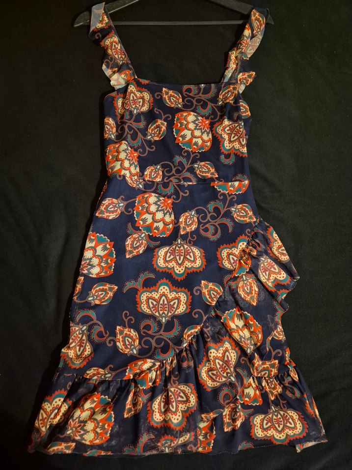 Fitted kesim, kolsuz, çok renkli desenli bohem elbise, volan detayları ile romantik akşamlar için uygun.