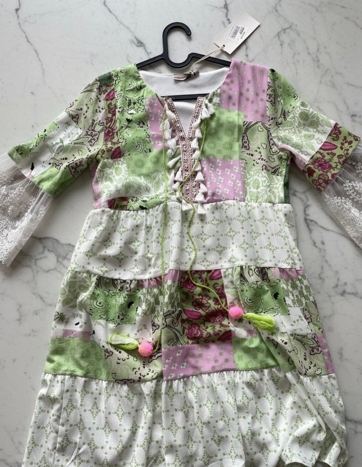 Yumuşak tekstil kumaştan, bol kesim, uzun kollu, V yakalı, dantel detaylı ve püsküllü çok renkli bohem elbise.