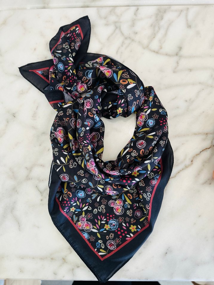 Sentetik kumaştan, çok renkli ve koyu tonlarda, bohem çiçek desenli, drapeli kadın fularıdır.
