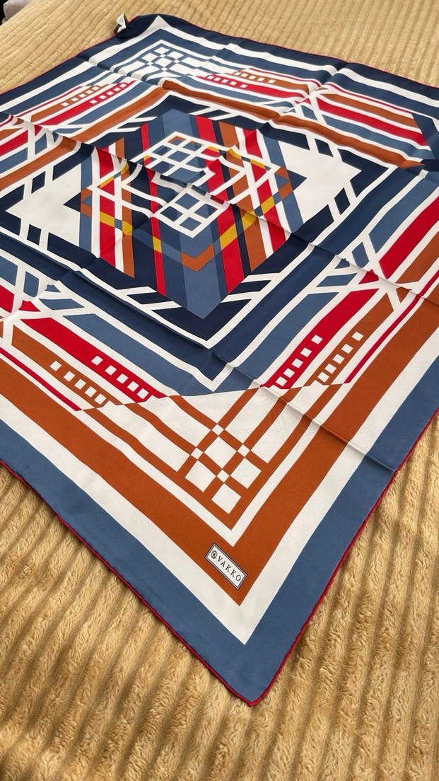 Kadın fular, çok renkli geometrik desenlerle bohem ve retro tarzda, yumuşak dokulu kumaştan, drapeli tasarıma sahip.