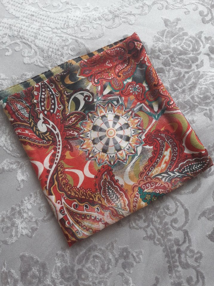 Sentetik kumaştan yapılmış, çok renkli ve koyu tonlarda bohem desenli, drapeli kadın fularıdır.