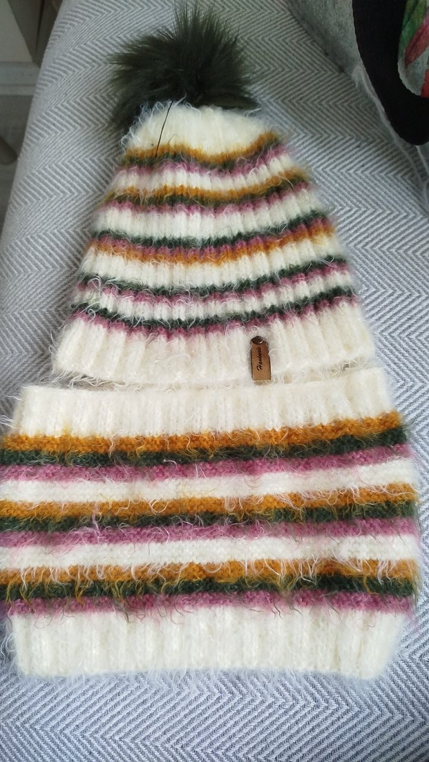 Kadınlar için hafif, çok renkli çizgili örgü bere,boyunluk takım,yumuşak dokusu ve rahat bohem tarzıyla öne çıkar.