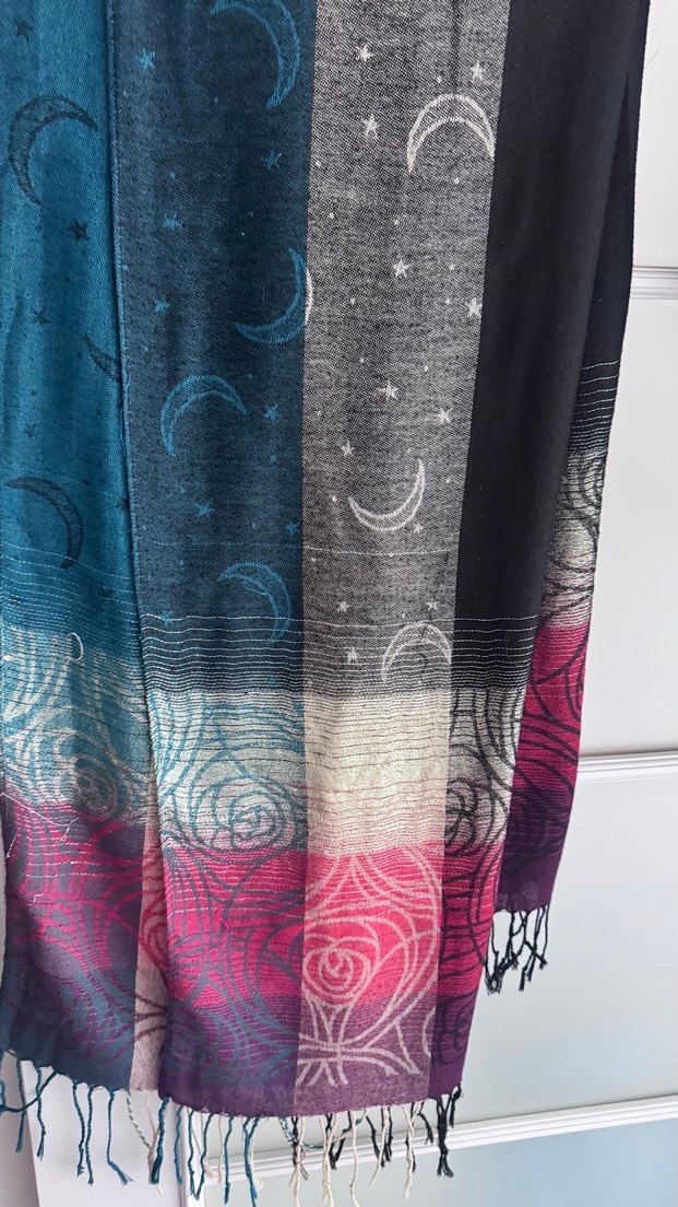 Ay ve çiçek desenli, çok renkli, yumuşak dokulu kumaştan bohem tarzda kadın şal.