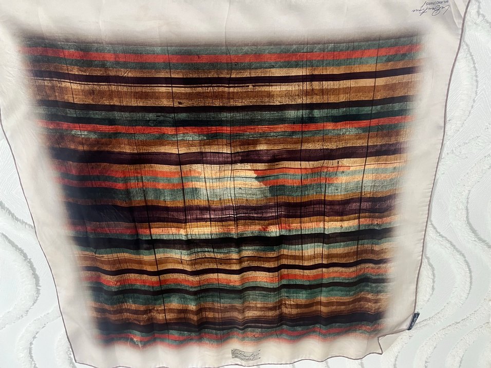Kadın şalı, çok renkli koyu çizgilerle drapeli tekstil malzemeden yapılmış, bohem, hippie ve retro tarzını yansıtıyor. La boutique