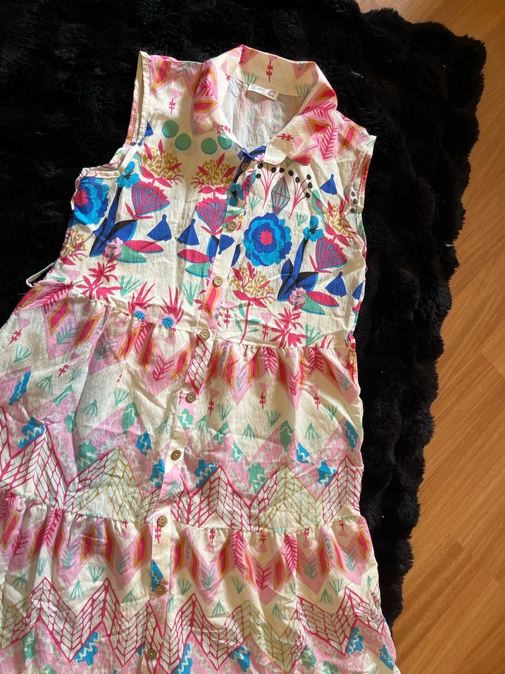 Kolsuz, bol kesim kız elbisesi, o elbisedir..kemeri kaybolduğu için iade edilemedi .. Pastel çok renkli desenli tekstil kumaş ve bohem tarzı sunar. İrma butikte yazın 1500 lira satış fiyatıylaydı..