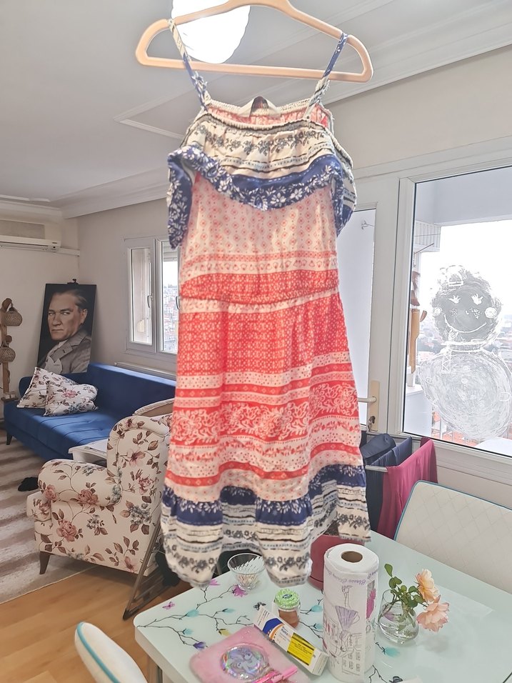 Askılı, kolsuz bohem kız elbisesi; gevşek kesim, çok renkli batik desenler ve fırfır detayları içerir. Hafif ve yumuşak kumaştan üretilmiştir.