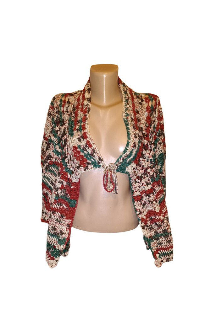 Uzun kollu, askısız yakalı, örgü kumaştan yapılmış çok renkli bohem bolero, tie-dye desenli ve bol kesimdir.