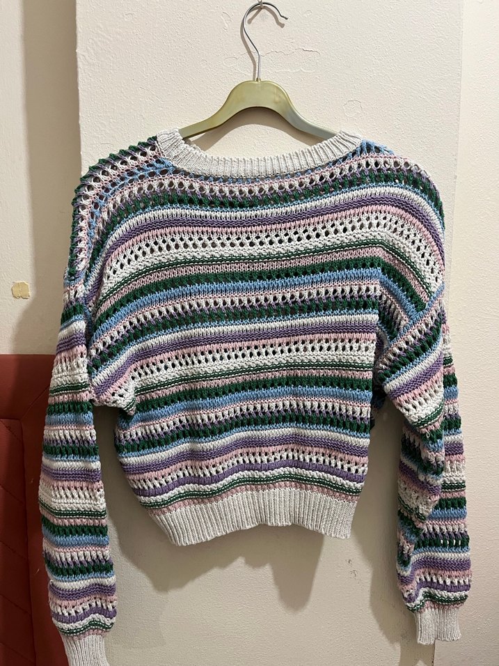 Bu bol kesim kadın kazak, çok renkli çizgili örgü deseni ve yuvarlak yakası ile gündelik kullanıma uygun, bohem tarzda rahat bir seçenek sunar.