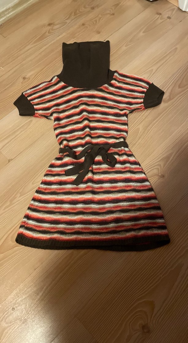 Çok renkli çizgili triko mini elbise, boğazlı yaka ve kısa kollu, bohem tarzında rahat bir görünüme sahip. Belde bağlama detayı bulunur.