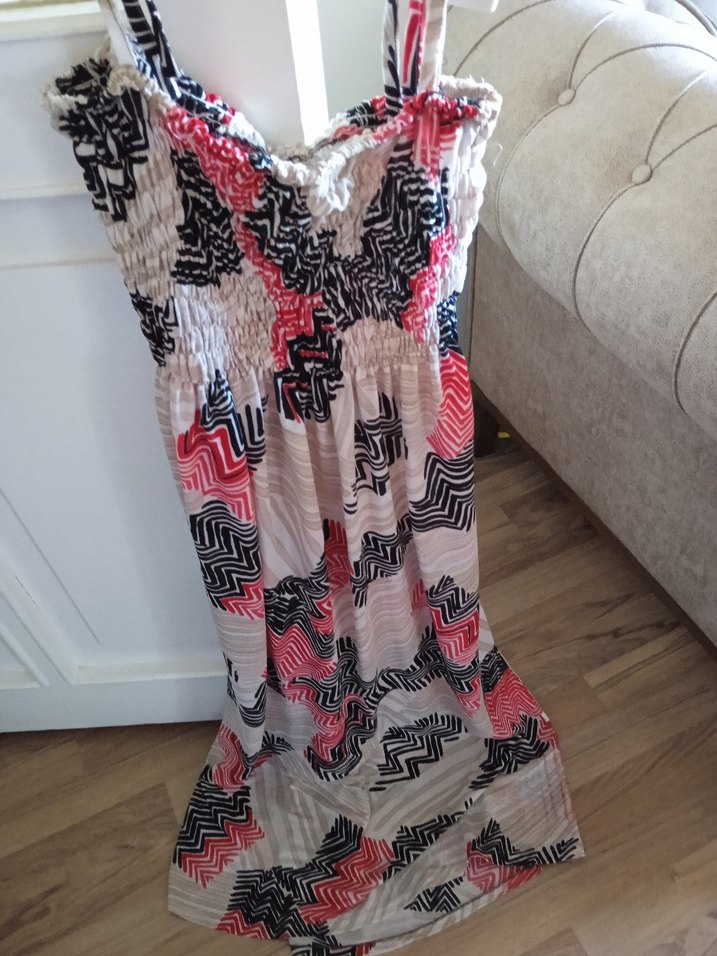 Askılı ve straplez yakalı, drapeli uzun ve vücuda oturan elbise. Koyu çok renkli tie-dye deseniyle bohem tarzı yansıtır.