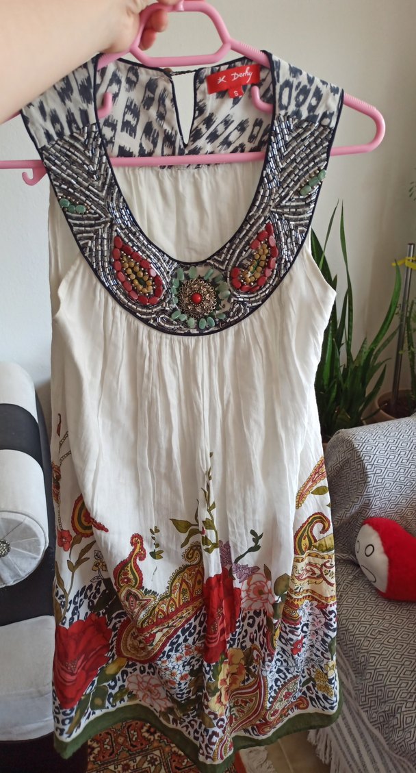Çok renkli, askısız yakalı, kolsuz elbise bol kesim ve bohem desenlere sahip diz üstü elbise