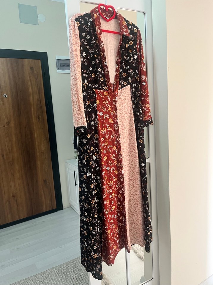 Çok renkli, desenli kumaştan yapılmış, bol kesim ve drapeli uzun elbisedir. Notlu yaka ve uzun kollu tasarımıyla bohem tarzı yansıtır.