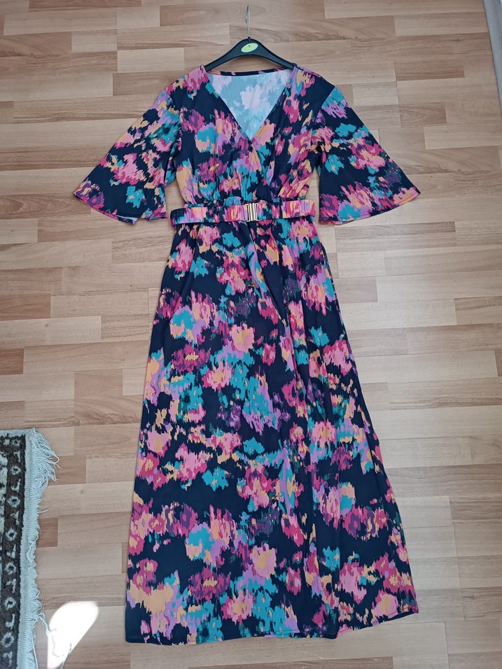 Çok renkli, bohem tarzda, V yaka, drapeli, bol kesim uzun elbise. Sentetik kumaştan, günlük kullanım için uygundur.