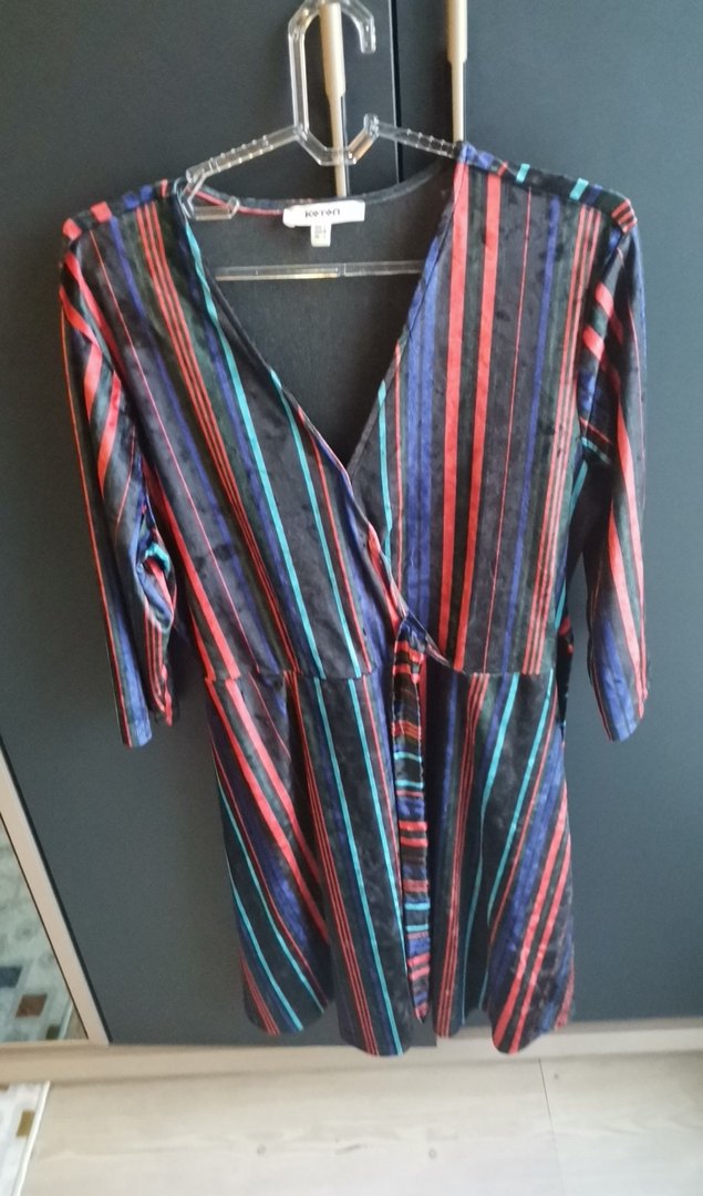 Bu kadın elbisesi çok renkli çizgili desene, diz üstü boy ve bol kesime sahiptir. Uzun kollu ve bohem tarzdadır.