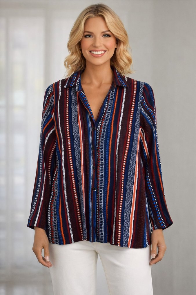 Çok renkli desenli tekstil kumaştan, bol kesim, uzun kollu kadın gömleği. Yaka kısmı düğmeli, midi boyda bohem tarzda tasarlanmıştır. ölçüleri görselde mevcuttur. yenidir