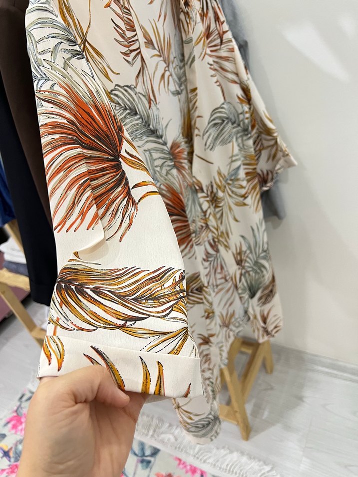 Kadın kimono, bol kesim ve uzun kollu tasarımı ile straplez yaka içerir. Sentetik kumaştan üretilmiş, çok renkli bohem baskılı ve drapeli detaylara sahiptir, günlük kullanıma uygundur.