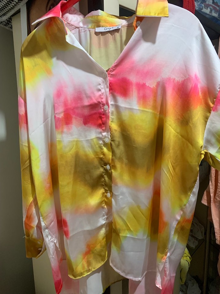 Bu bol kesim kadın gömleği, yakalı ve düğmeli ön detaylara sahiptir. İpeksi dokusu ve açık çok renkli batik deseniyle uzun boyda, bohem tarzını yansıtır. Bir kaç kez giyildi artık artık düz renk takıldığım için satıyorum :)