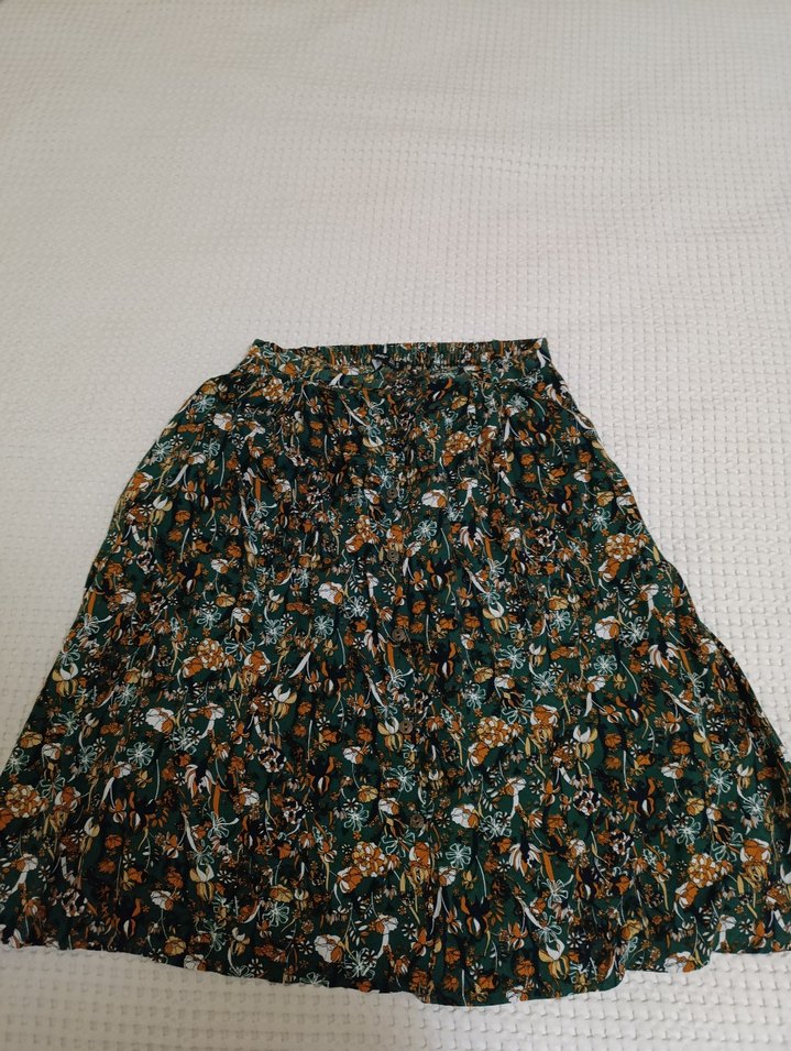 Piliseli ve bol kesim, çok renkli koyu çiçek desenli hamile eteği, yumuşak sentetik kumaştan, dış mekan kullanımı için uygundur.