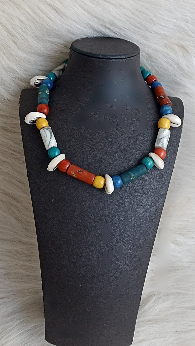 Çok renkli boncuklar ve deniz kabuğu detaylarıyla bohem tarzda bağlama desenli kolye.
