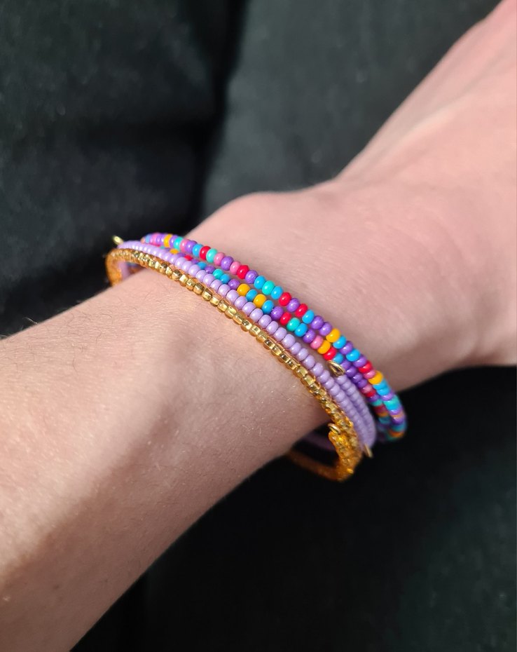 Renkli boncuklardan oluşan, tie-dye desenli bohem tarzda bileklik. Altın, lila ve karışık renkli olacak şekilde 3 parçadan oluşmaktadır. Canlı renkleri ve karşı kültür havasıyla günlük kullanıma uygundur.