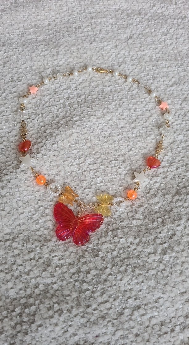 Bohem tarzda, kırmızı kelebek kolye ucu ve çok renkli, işlemeli çiçek detaylı boncuklu kolye. Midi uzunlukta, parti için uygun.