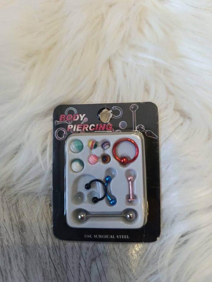 Çok renkli, boncuklu piercing seti, koyu renklerde ve rock punk tarzında. Cerrahi çelikten yapılmıştır, grunge punk havasına uygundur.