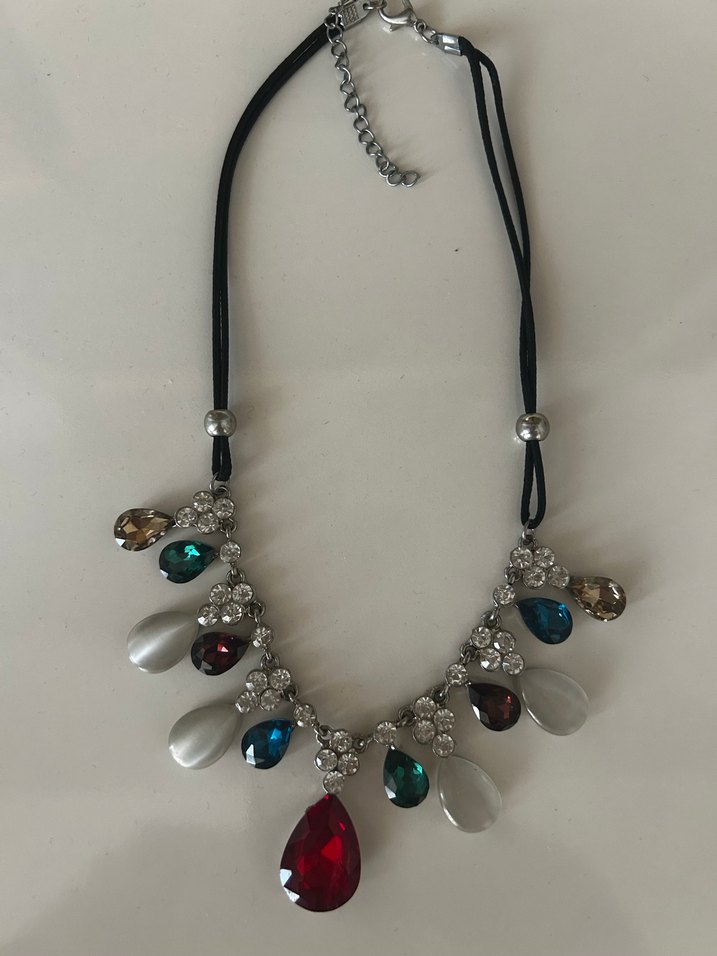 Uzun boyda, çok renkli boncuklu desenli kolye, damla şeklinde taşlar ve parlak detaylarla romantik akşamlar için uygun.
