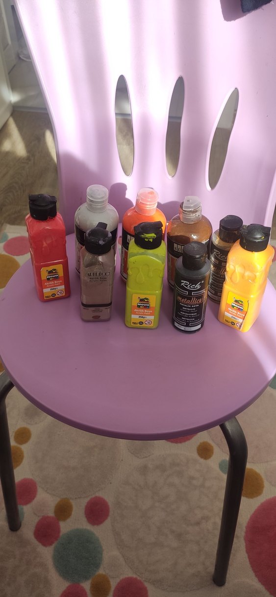 Metallic ve floresan tonlar içeren çok renkli canlı boya seti, yaratıcı projeler için uygundur. İkinci el işi bıraktığım için satyrm.