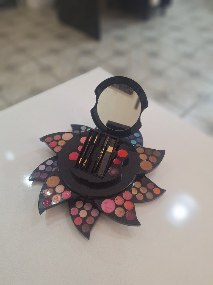 Çiçek şeklinde kutuda, çeşitli canlı koyu tonlarda çok renkli göz farı paleti, içinde ayna ve aplikatörler bulunur. ayrıca ruj fırçalar göz kalemi kapatıcıları allıkları da mevcut sadece bir kaç kere kullanıldı tertemizdir Almanya dan hediye geldi Marka temsilidir