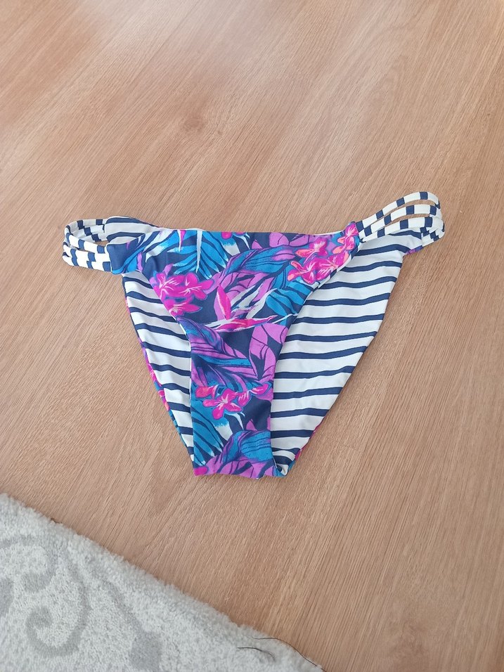 Çok renkli çiçekli ve çizgili desene sahip, yanları ince bantlı ve elastik yapıda bikini altı.