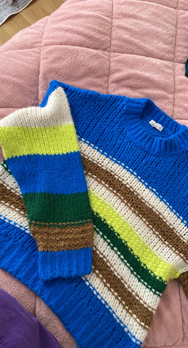 Bohem tarzda, uzun kollu ve yuvarlak yakalı bol kesim örgü kazak. Pastel renkli çizgilerle rahat ve retro bir görünüm sunar.