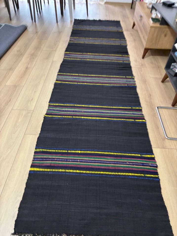 Koyu taban üzerine canlı çok renkli çizgilerle süslenmiş klasik tarzda halı.  doğal ve sağlıklı malzemeden kök boyasıyla yapılmış tamamen el dokuma kilim, halı. Evin her yerinde kullanılabilir sıfır ürün hiç kullanılmamıştır. Hafif oluşu pratik kullanım sağlıyor . ebatları: 3.55 uzunluk 88 cm genişlik . Aynı üründen iki adet mevcut. İkisini alana pazarlık payı vardır