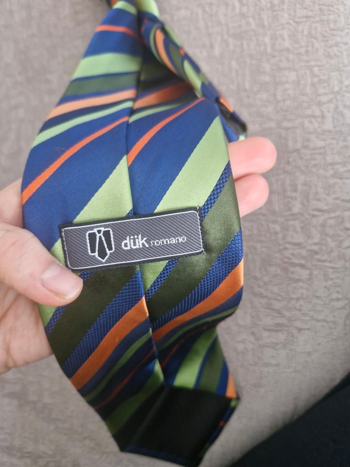 Bu erkek kravatı, koyu mavi, yeşil ve turuncu tonlarında çok renkli çizgili desene sahiptir. Moda tutkunları için modern ve avangart bir tarza sahiptir.