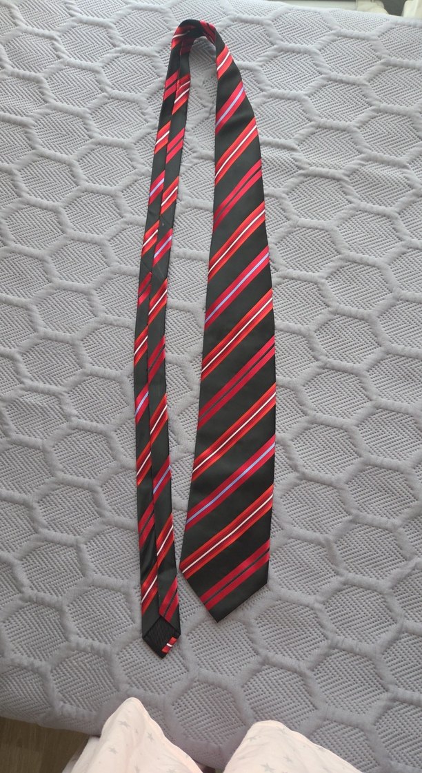 Çok renkli çizgili desene sahip erkek kravat, kırmızı ve gri tonlarıyla dikkat çeker.