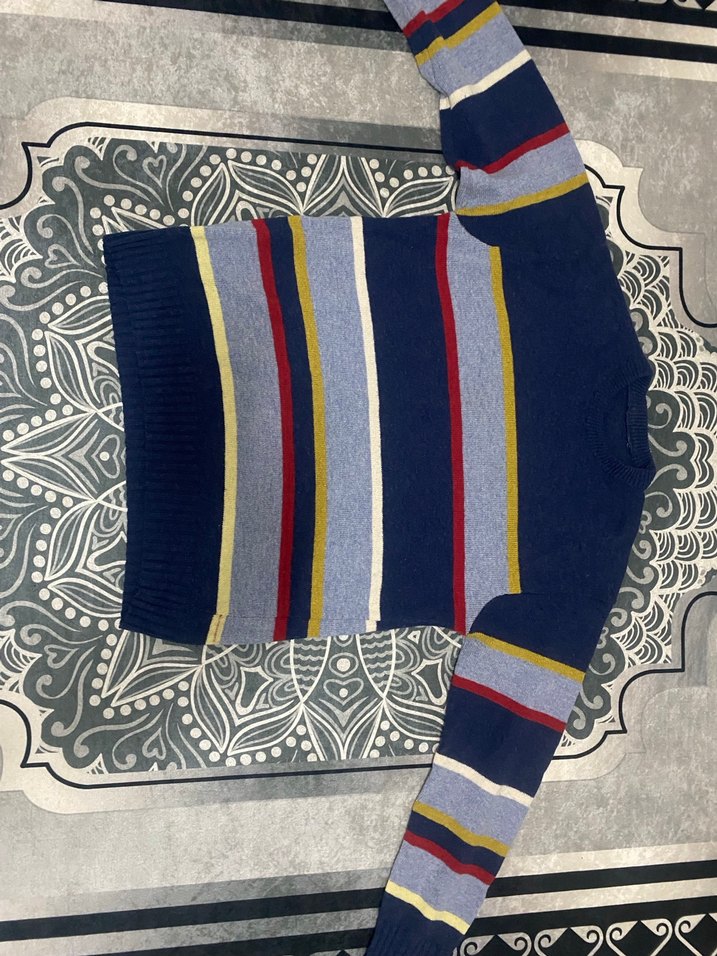 Erkek triko kazak, fitted kesim, uzun kollu ve tekne yaka ile tasarlanmıştır. Yumuşak örgü kumaştan çok renkli çizgili desene sahiptir. Rahat ve trend günlük stil sunar. Kusursuz temizliktedir