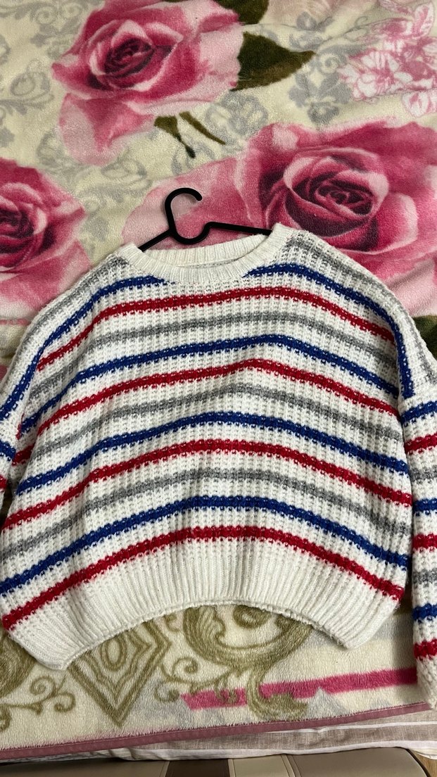 Uzun kollu, bisiklet yaka, bol kesim kadın örgü kazak. Gri, kırmızı ve mavi çok renkli çizgilerle örülmüştür, rahat sokak tarzı için uygundur.