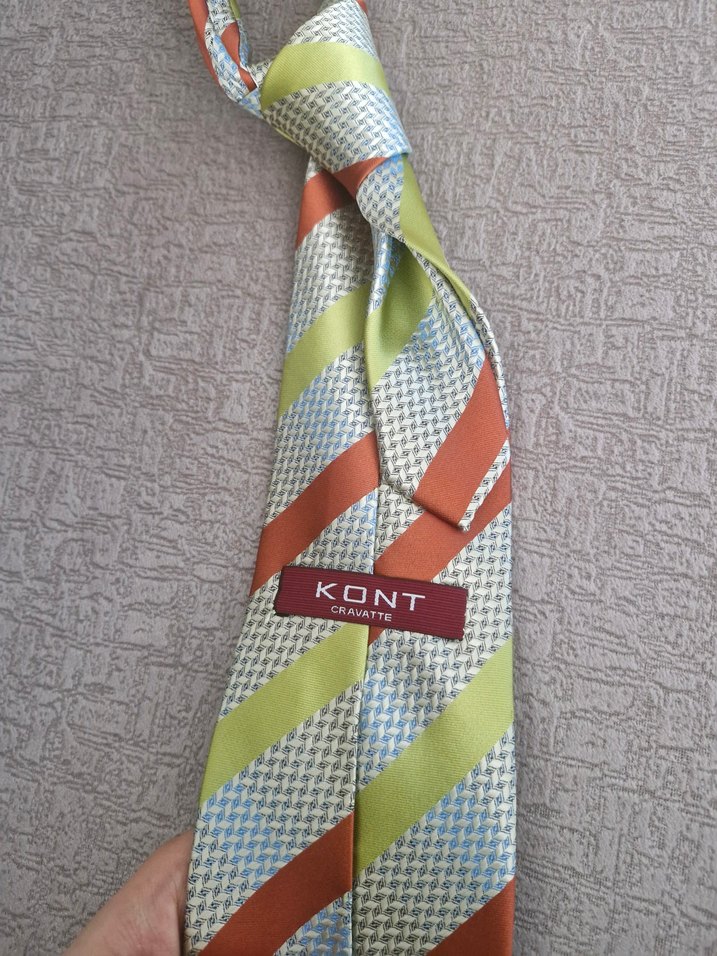 KONT markalı, gri, turuncu, mavi ve yeşil renklerde çizgili çok renkli kravat. Moda ve yenilikçi tarz için uygun.