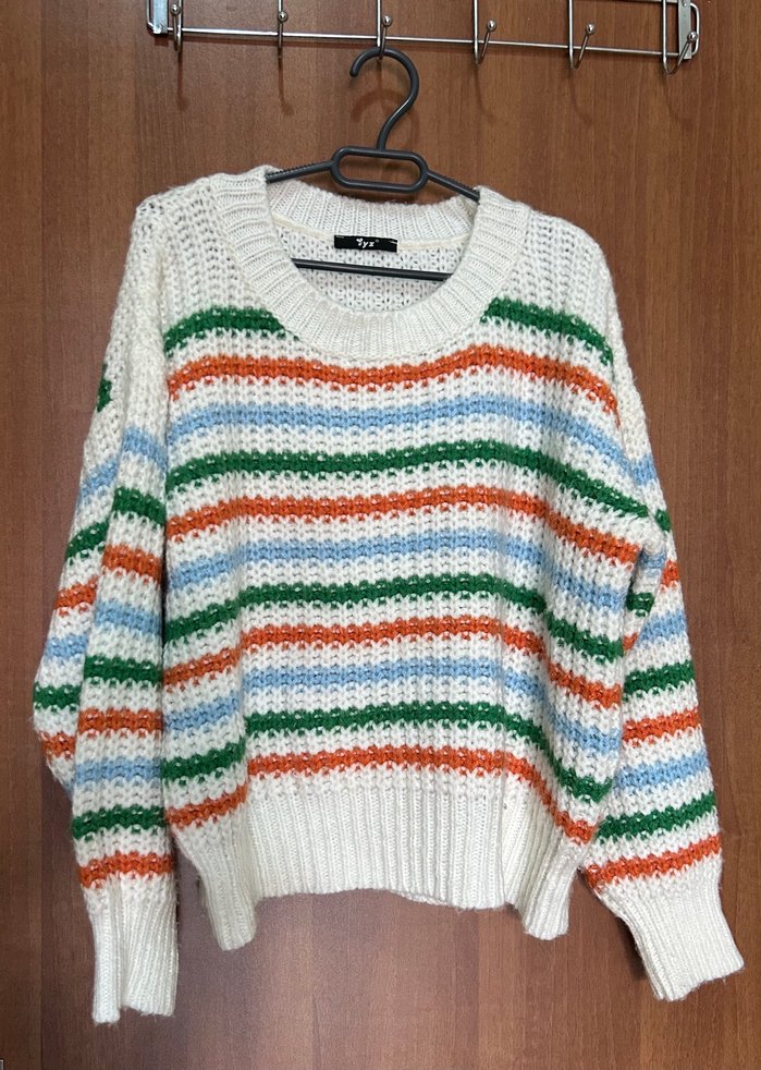 Bu kadın kazak, hafif çok renkli çizgilerle rahat örgü dokusuna sahiptir. Yuvarlak yaka, uzun kollu ve bol kesimlidir, günlük kullanım için bohem sokak stili sunar. Ürün standart beden ve oversizedır. Sıcacık tutuyor. 1-2 kez kullanıldı herhangi bir hasarı yok.