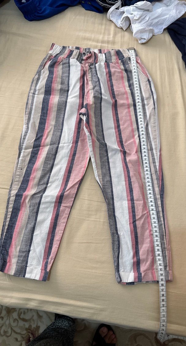 Pamuklu, bol kesim, çok renkli pastel çizgili ve düğmeli cocuk pantolonu, günlük rahat sokak stili için uygun.
