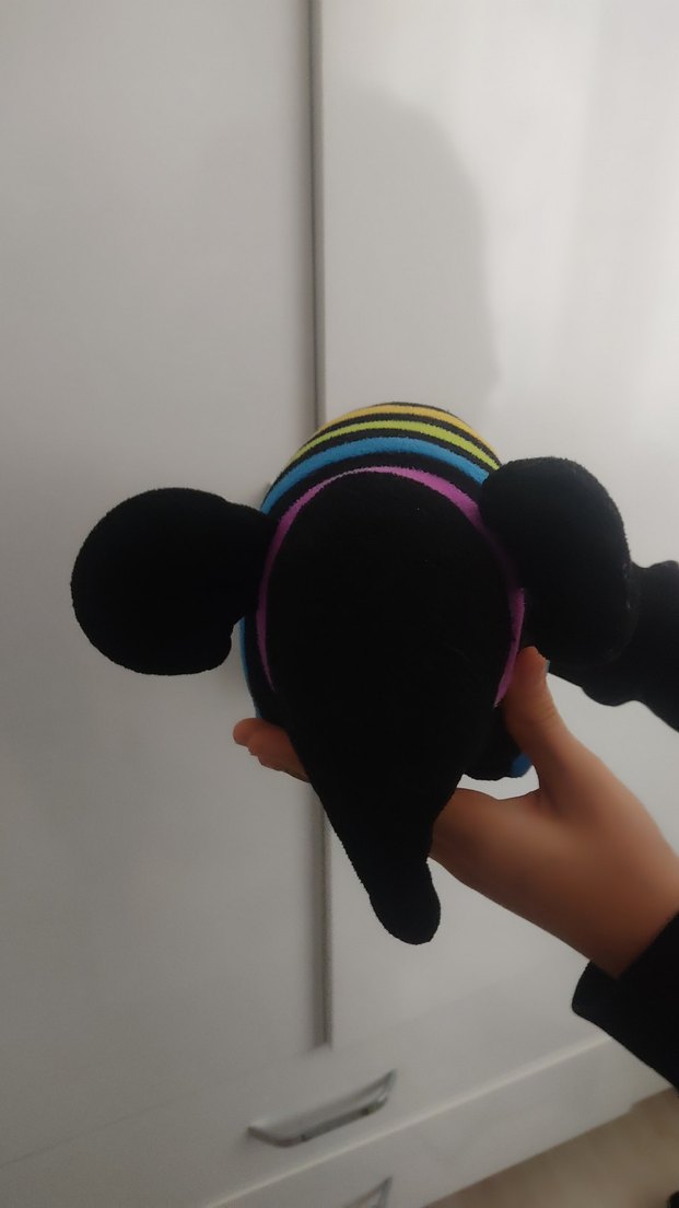Koyu renk kulaklara ve çok renkli çizgili yumuşak kumaştan yapılmış gövdeye sahip peluş oyuncak.